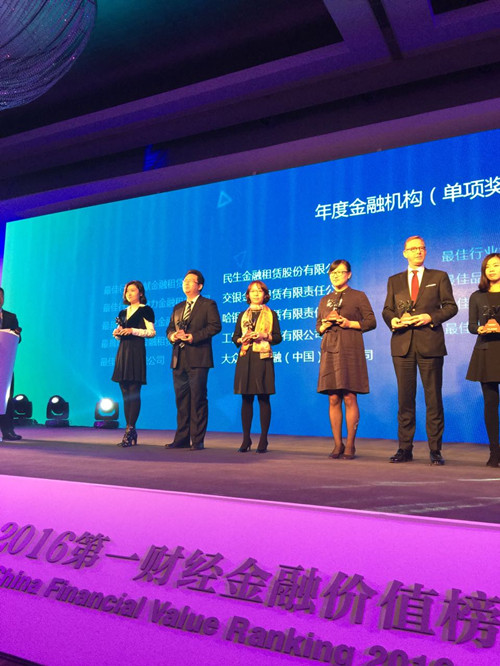 ? ? ? ? 2016年11月18日,我司憑借在涉農(nóng)租賃業(yè)務(wù)領(lǐng)域的深耕與成就,連續(xù)三年入選“第一財經(jīng)金融價值榜”(CFV),榮膺“2016年度最具競爭力農(nóng)業(yè)金融租賃公司”獎項,財務(wù)總監(jiān)王慧媛女士代表我司參加了頒獎盛典。金融租賃同業(yè)中,民生租賃、交銀租賃和工銀租賃公司亦榜上有名。